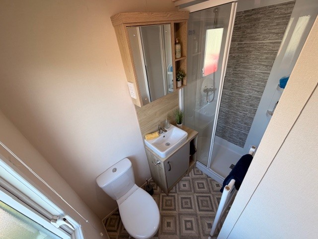 The stylish main shower room includes a large enclosed shower, basin, and toilet — perfect for family living or hosting guests.