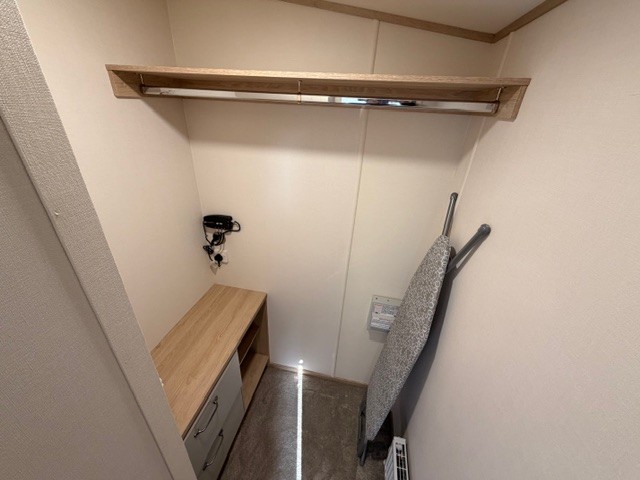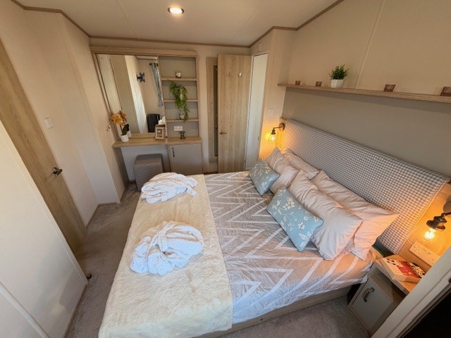 The master bedroom spans the full width of the holiday home and features a king-size bed, bedside tables with integrated lighting, a dressing table, walk-in wardrobe, and additional under-bed storage. A private ensuite shower room completes this luxurious retreat.